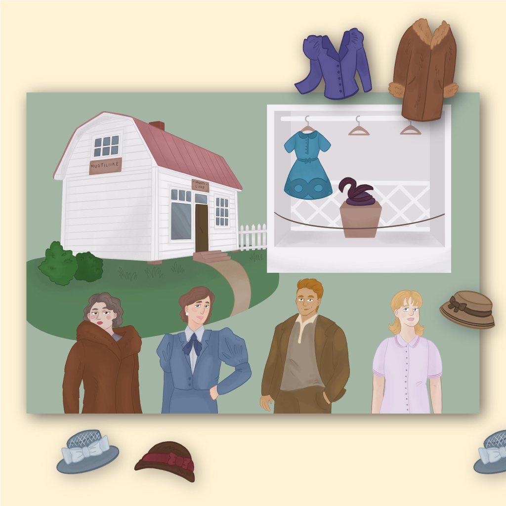 Kuvituksia Lyylin Muotiliike- ja Suoltijoen Savotta pakohuonepeleihin.