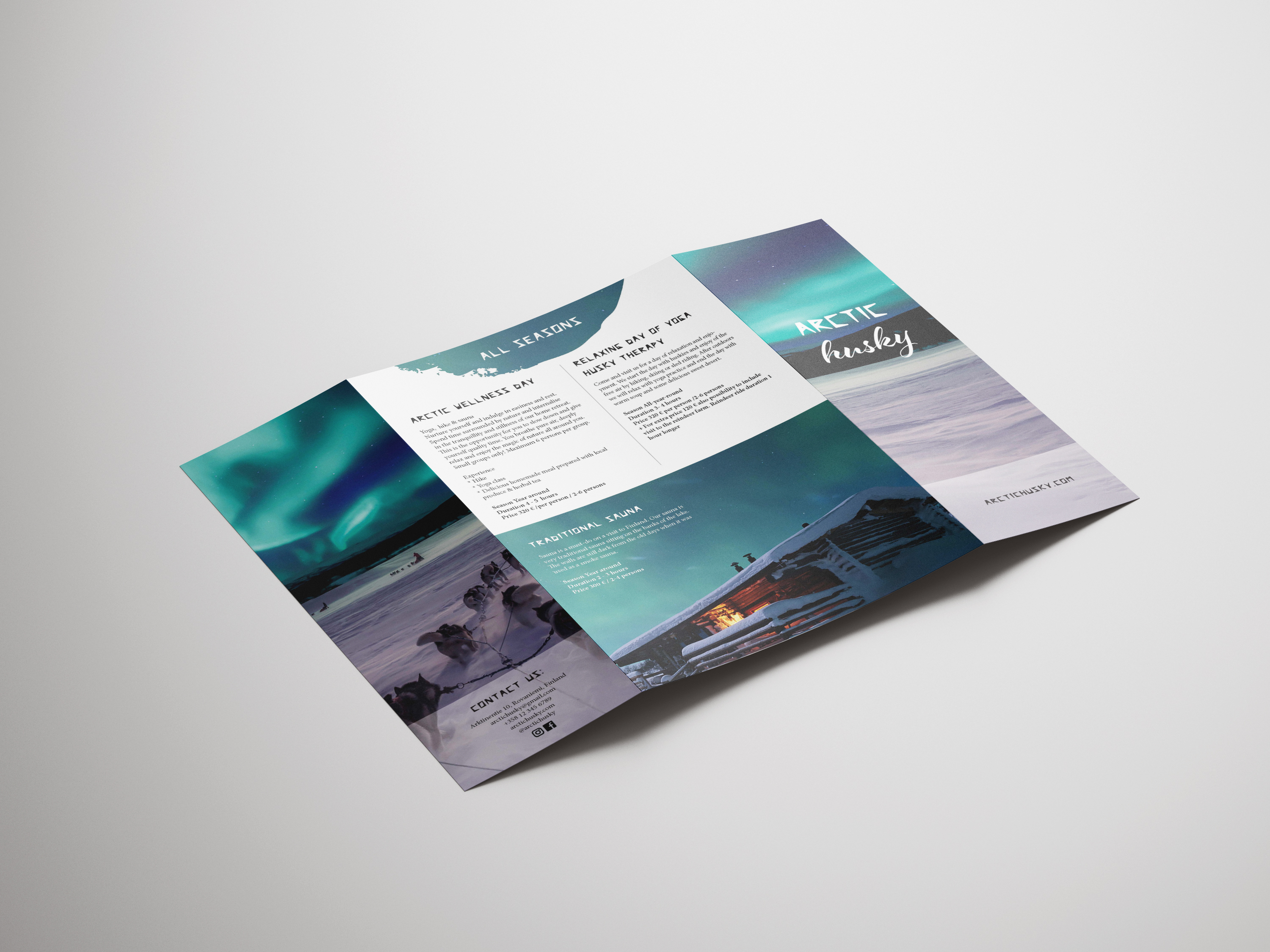 Arctic Husky esite. Yritys on kuvitteellinen ja toteutettu osana yliopisto kurssia. Valokuvat eivät ole omiani.