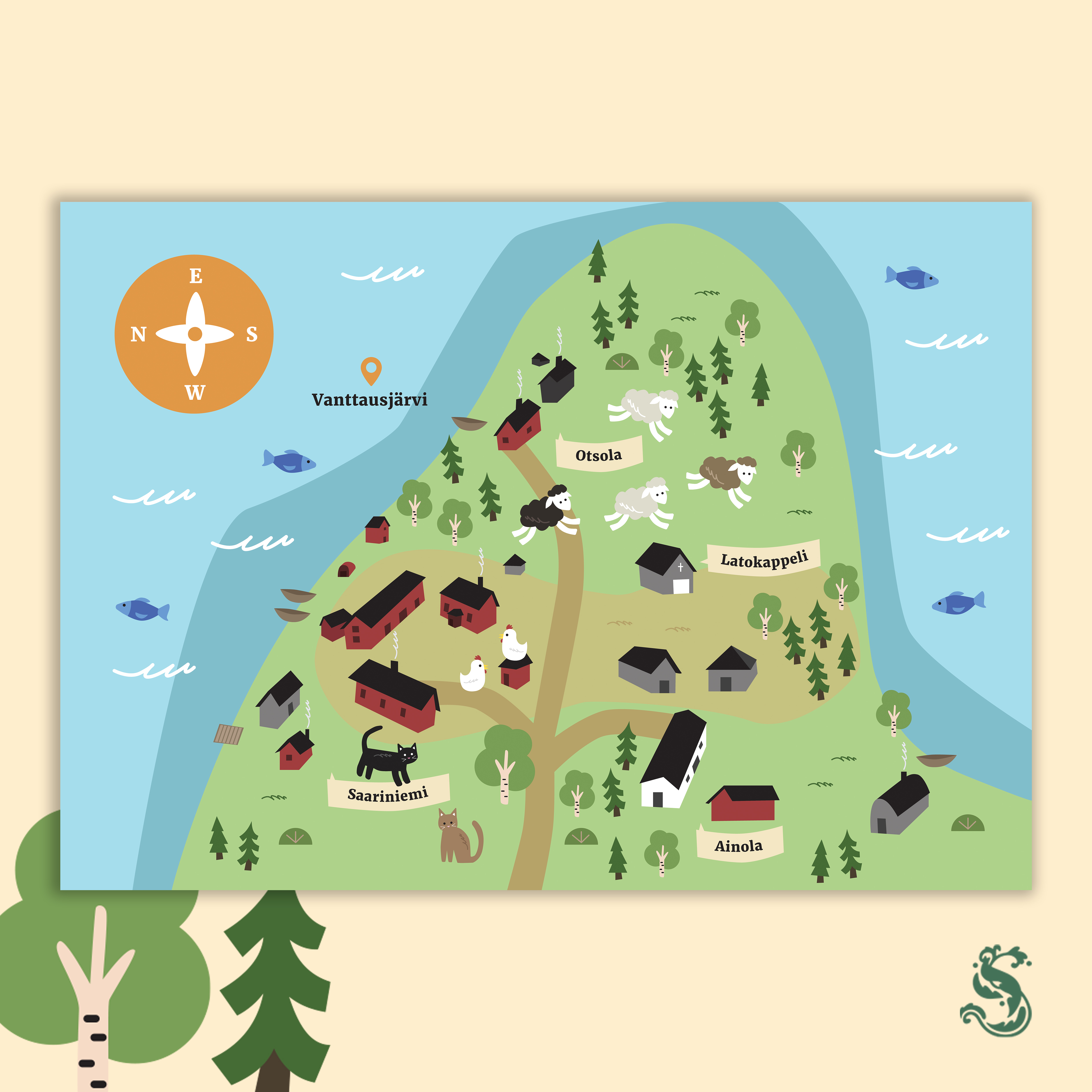 Lapland Deluxelle toteutettu kuvitettu kartta Saariniemen tilasta, lähiympäristöstä ja rakennuksista.